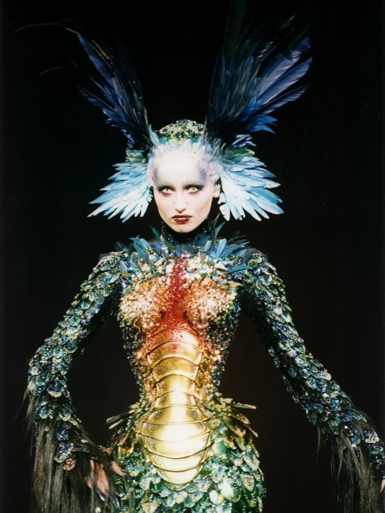 Difficile d’évoquer ces créatures hybrides sans mentionner la robe « chimère » signée Thierry Mugler. La robe porte le nom d’une créature mythologique extraite de l’Antiquité grecque, et composée d’animaux épars : un morceau de lion, une tête de chèvre, une queue de serpent… Dévoilée en 1997, cette robe démesurée figure parmi les créations les plus emblématiques du couturier français. Serait-ce en raison de l’insuffisance des mots pour décrire ce que l’on voyait ? Reptile, oiseau, poisson, fauve, cheval, les espèces et leurs matières se confondent. Le torse doré et strié se transforme en écailles. L’éclat rouge sur le sternum vire au vert sur les bras et les jambes. Les manches ainsi que le bas de la robe se terminent en longues franges de poils chevalins. Enfin, la tête est casquée de longues plumes d’oiseaux dans divers tons de bleus.
