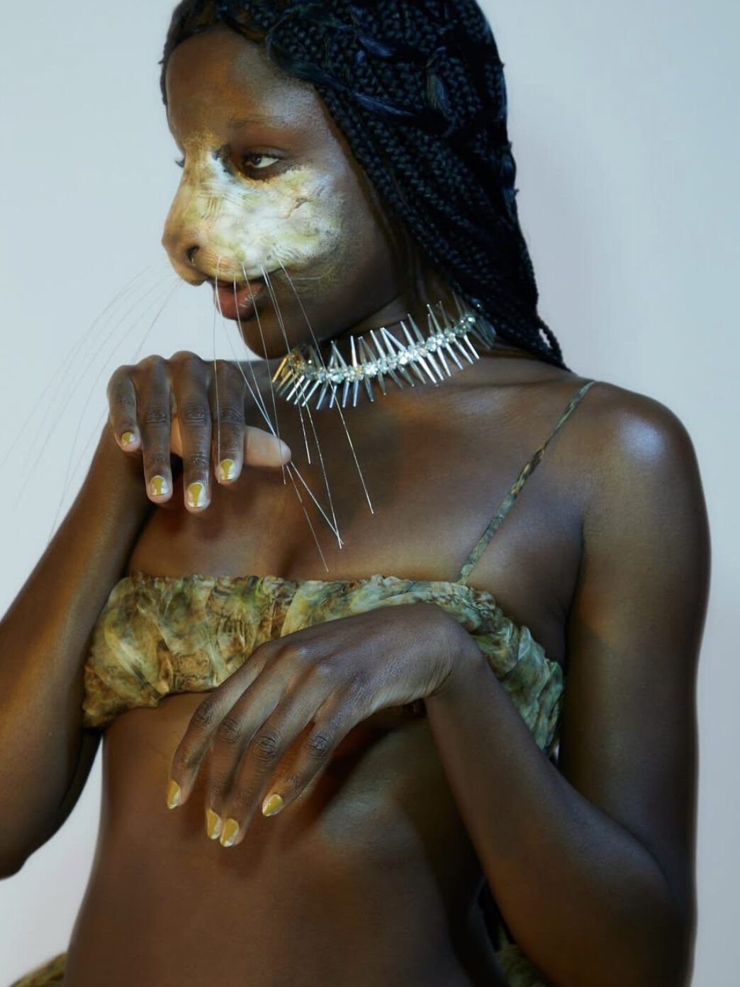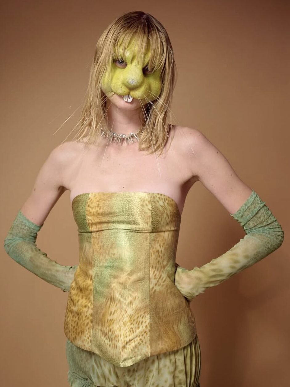 Hillary Taymour, fondatrice de la marque Collina Strada, pour qui l’animal occupe une place centrale au cœur de ses collections, travaille depuis des années avec des prothèses afin d’explorer des thèmes de transformation et d’identité de genre. Si l’industrie de la mode n’a pas toujours été conquise par ses collections, les jugeant trop étranges, la créatrice new-yorkaise affirme que « la mode peut être inquiétante tout en restant belle, et que le malaise peut être un outil de design, et non une erreur ».