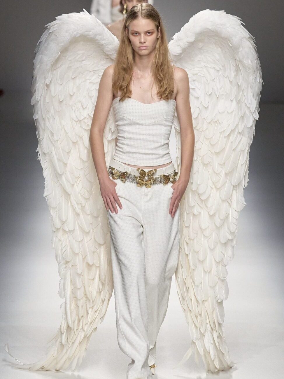 Une créature non identifiable qui rappelle les silhouettes de chez Maison Martin Margiela dans les années 80. Ici, l’homme invisible de la mode portait si bien son nom qu’il dissimulait le visage de ses mannequins afin de mettre le vêtement au premier plan. Selon Vassilis Zidianakis, conservateur d’expositions de mode et d’art moderne, « (Martin Margiela) a inventé une créature sans le vouloir ! » (pour Madame Figaro). À contrario, d’autres marques choisissent de réinventer des créatures purement spirituelles, dont la forme demeure familière. C’est le cas de l’ange, qui se révèle gracieux et lumineux chez Blumarine (collection printemps-été 2024), tandis qu’il semble souffrir d’un burn-out au show automne-hiver 2025 de Matières Fécales