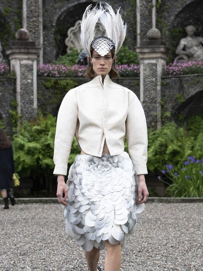 À quoi ressemble une créature sur un podium ? Chez Rick Owens, elle prend la forme d’un je-ne-sais-quoi extraterrestre, inventant de nouvelles silhouettes corporelles. Pièces sombres et sculpturales, son goût pour le futurisme donne naissance aux légendaires bottes en cuir (collection automne-hiver 2025), réalisées par le designer parisien Victor Clavelly. Moitié plumes, moitié cuirasse. Moitié dragon, moitié humain. Une créature hybride semble apparaître. Une vision que l’on retrouve également chez Louis Vuitton lors du défilé Croisière 2024. Nicolas Ghesquière y réinterprète des femmes amphibies défilant à Isola Bella, sur le lac Majeur en Italie, un lieu qualifié par la maison comme étant « un écrin de verdure suspendu entre mythes et réalité ».