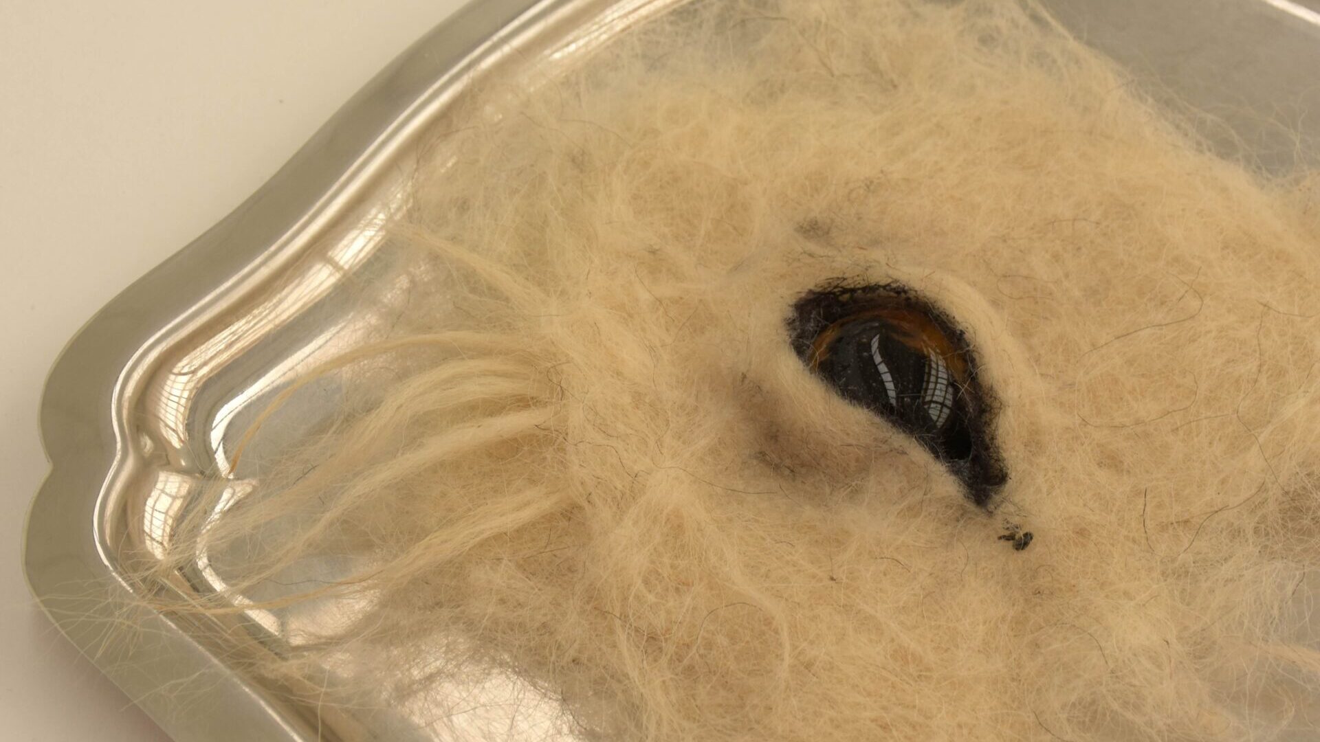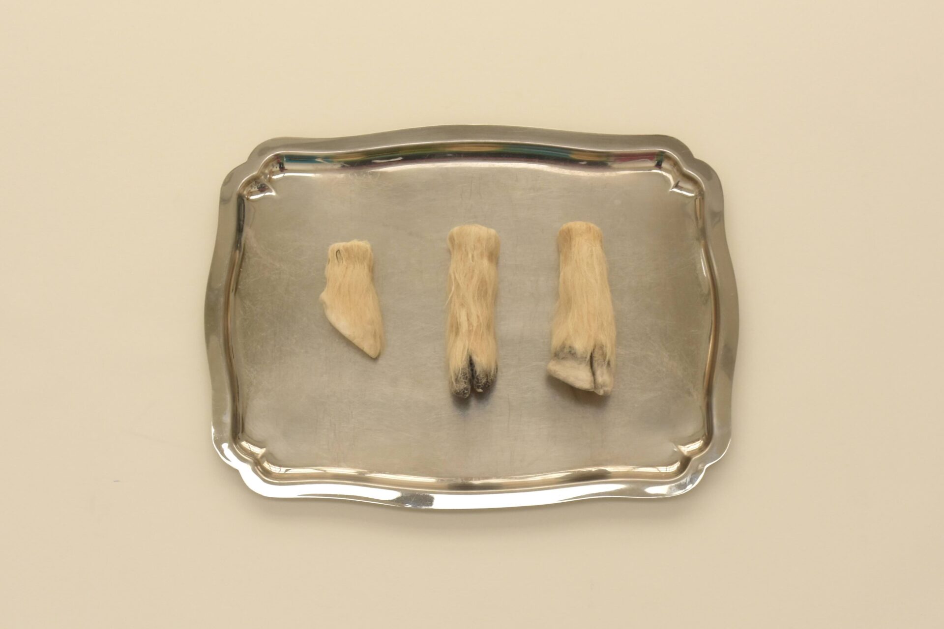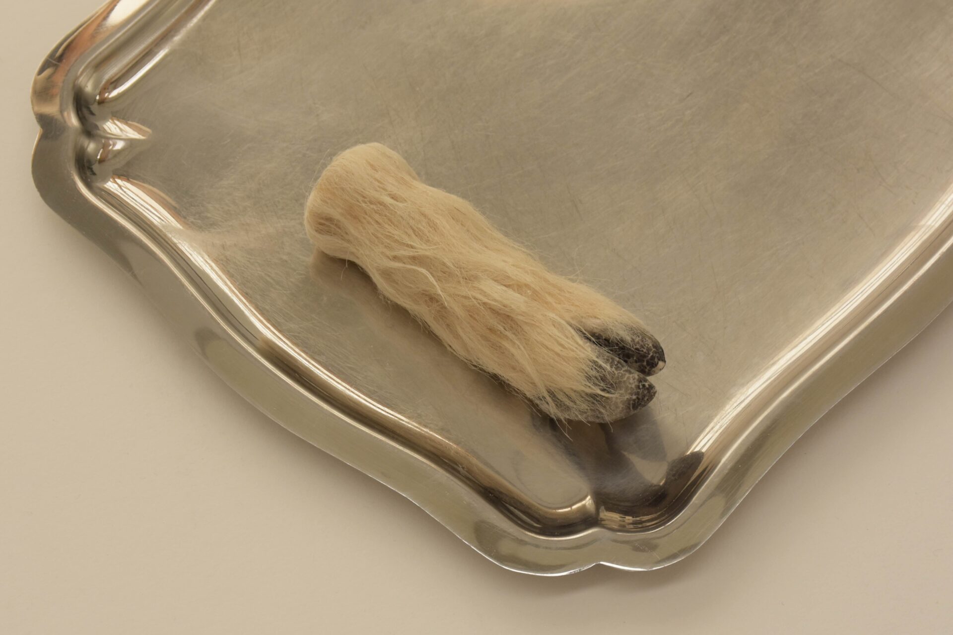 Au terme de cette ébullition artistique et créative, le projet prend la forme d’une installation artistique. Emilia a fait le choix de créer un espace immersif presque ludique. Sur un sol recouvert de paille, un cube central blanc présente trois assiettes en inox. Chacune d’elles contient des fragments de l’animal, la patte, l’œil et la peau, présentés tels des offrandes religieuses. Sobriété, précision et étrangeté caractérisent l’ensemble. Face à ce dispositif, les réactions sont révélatrices : « Le public était souvent intrigué. Il n’y avait pas forcément de « wow c’est super beau », mais des personnes qui voulaient s’approcher pour comprendre ce qu’elles avaient sous les yeux. » Un étonnement produisant parfaitement l’intention initiale du projet : « Les gens se demandaient surtout pourquoi ce projet-là, alors que ça paraît si simple. »