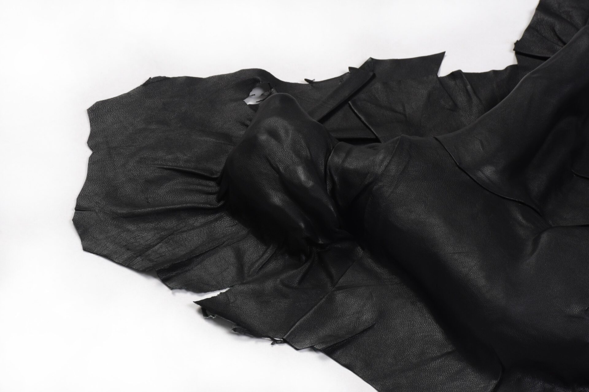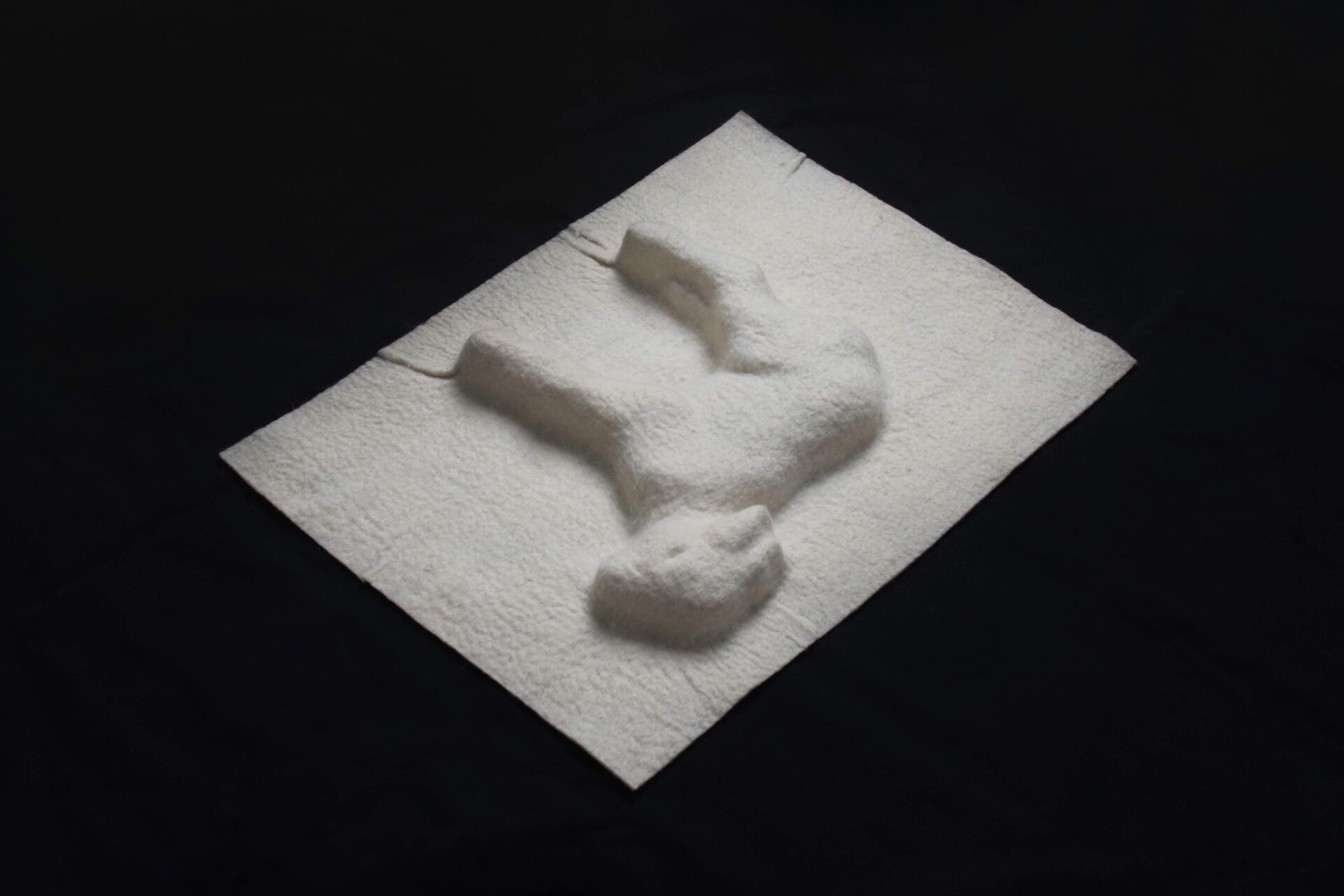 Pendant cette année de diplôme, les étudiants doivent d’abord produire un essai sur le sujet choisi, pour ensuite développer un projet plastique. Emilia fait le choix d’une approche narrative, explorant les différents symboles de l’animal, grâce à un système de récits plutôt qu’à une problématique classique. Progressivement, la réflexion théorique laisse place à l’exploration plastique. Cette seconde partie commence tout d’abord par la collecte de matériaux. Emilia explique que : « La laine était un peu le choix naturel, mais c’est aussi le matériau qui représentait bien les propriétés que je voulais explorer : la fragilité ou, au contraire, la rigidité, selon comment la laine est traitée. » En parallèle de la laine, s’ajoute un cuir noir, introduisant un contraste marqué avec la laine claire, presque décomposée. Cet aller-retour entre textures, tensions et propriétés devient central dans la démarche et fait la richesse de la recherche plastique d’Emilia. L’agneau n’est plus seulement un sujet, il devient un véritable terrain de recherche et d’expérimentation plastique.
