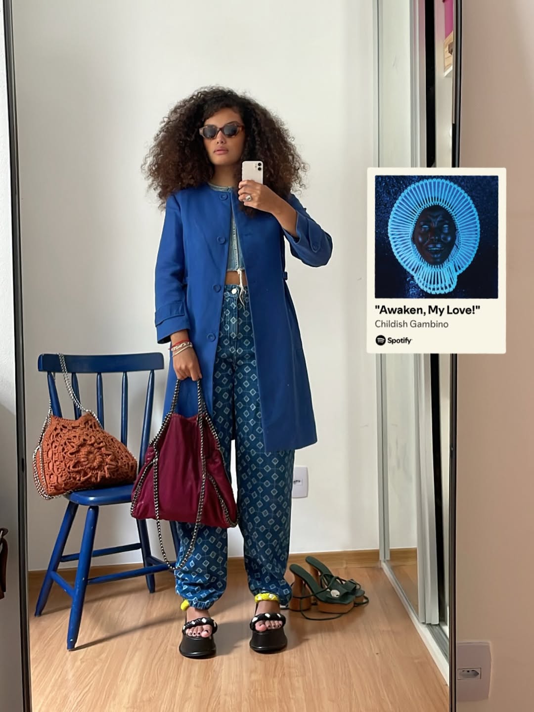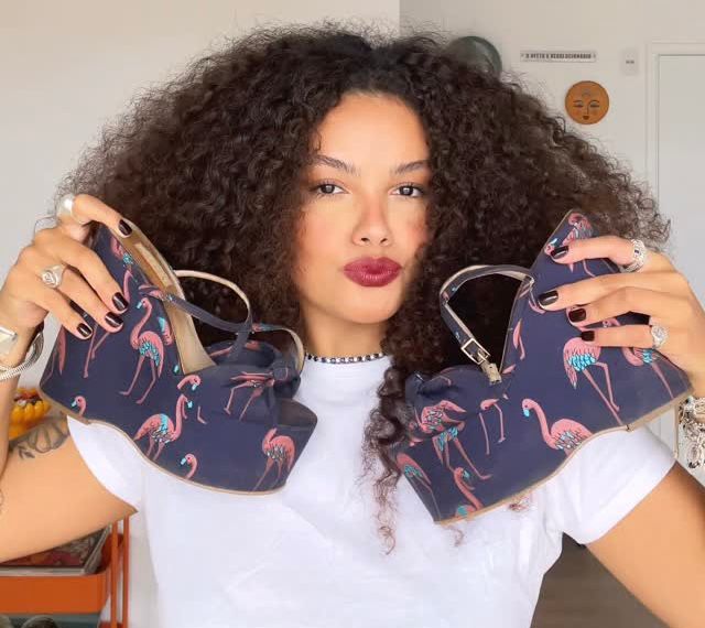 Ce goût l’a suivie pendant l’adolescence et le début de sa vie d’adulte, quand Tamires a pu s’offrir sa première paire de tamancas avec son salaire de vendeuse, marquant le début de sa collection. L’un des jalons de cette collection est la « tamanca babylonienne », comme elle décrit ses talons vertigineux bleus à motifs flamants roses, arrivés dans son dressing en 2018 directement de Londres ; un autre est la réalisation d’un rêve d’enfant : une Lui Lui dénichée dans une friperie en ligne.