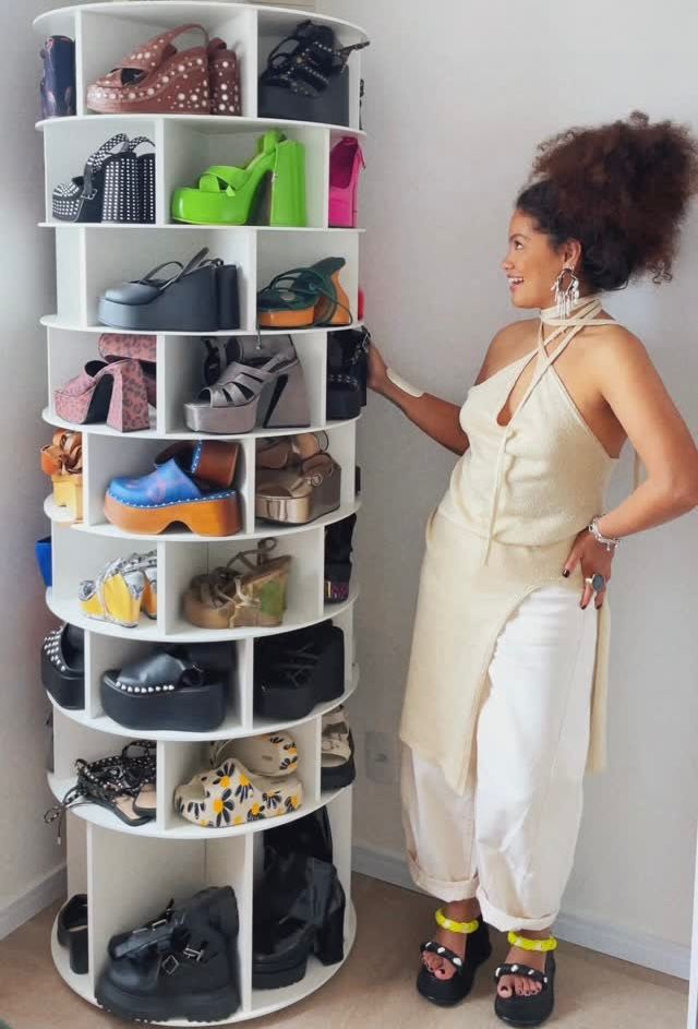 Tamires possède environ 60 paires de chaussures, disposées sur une étagère cylindrique rotative dans sa chambre, qu’elle montre avec fierté lors de l’entretien. « Je rêvais d’avoir un endroit pour voir mes sandales, car pour moi ce sont des œuvres d’art, cela n’avait aucun sens de les laisser dans une boîte. Quand j’ai fait fabriquer ce meuble, j’ai vraiment nourri mon enfant intérieur », plaisante-t-elle.